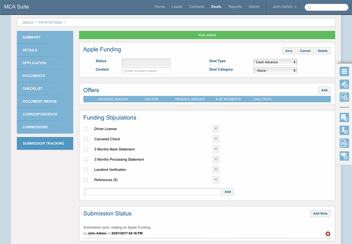 Again, you’ll have the option of setting a submission status. Likewise, you can update the deal status. Since we haven’t set either of those up, you can ignore them for now. Let’s enter a note, fill out the remaining fields and click ‘Save’. This will bring you back to the submission tracking page for Petey’s Pizza and have the selected offer for Apple Funding highlighted.