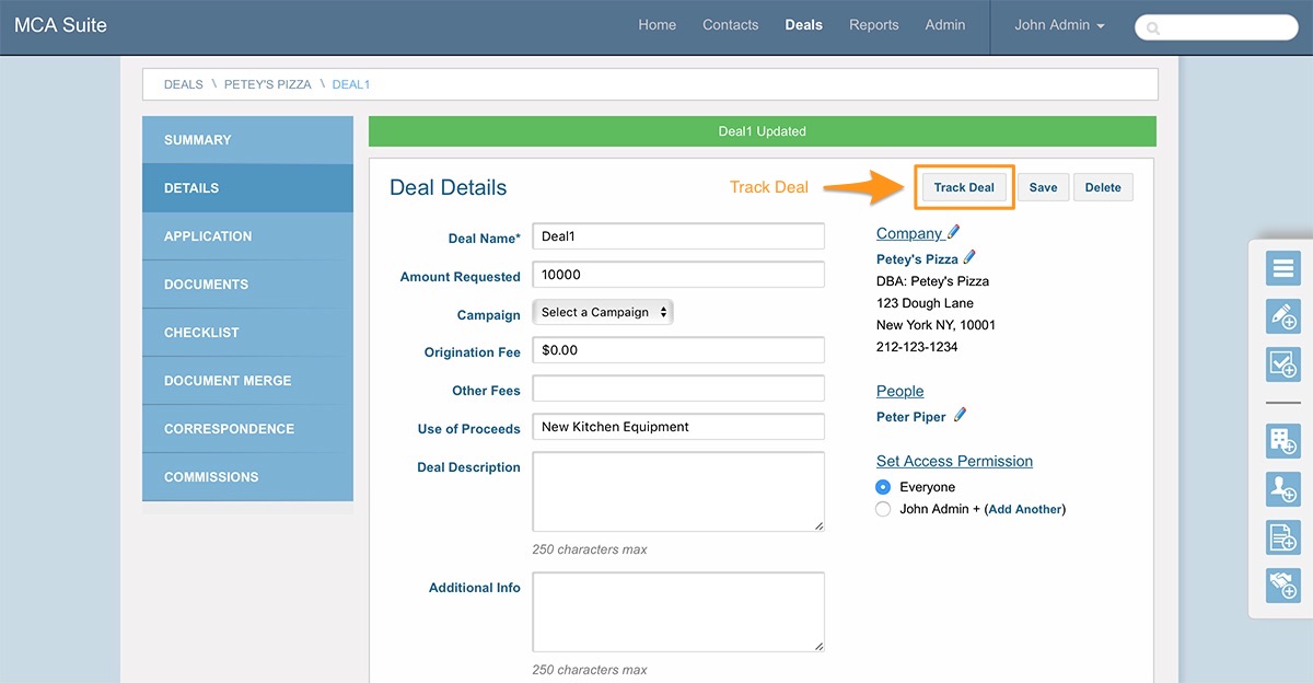 After submitting the application, you’ll be brought to the Deal Summary page. This page shows summary information about the deal, the merchant company and the people associated with that company.
